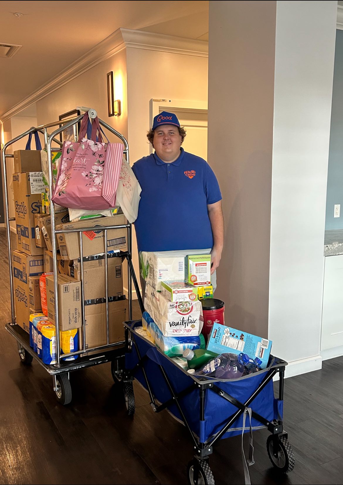 In August 2024 we celebrated Drew's 7th heart transplant anniversary by delivering a shipment of item to the Bartch Transplant House at AdventHealth Orlando. We made a delivery just in time because they were in need of paper towels. We always accept donations for the transplant house, the Ronald McDonald Houses and for our tote bags. We have a dedicated space to store items prior to delivery. If you're ever at a store with sales, Bogo deals or large quantities and think to pick up an extra paper product, cleaning product or breakfast item like bars, grits or oatmeal we would greatly appreciate it and will add it to our delivery items. Thank you to everyone who donated supplies!